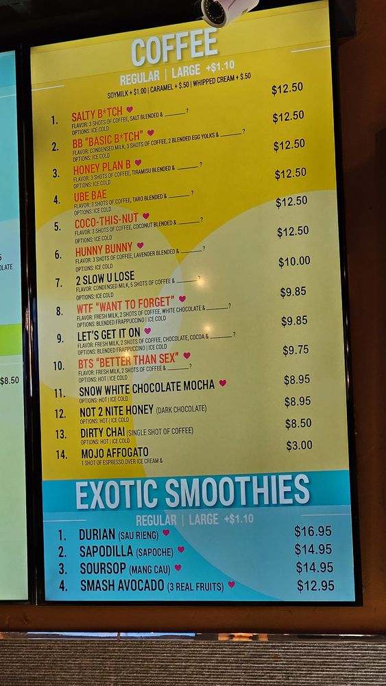 3 shots of coffee, coconut blended & tony special recipe ice cold only. Drink from lid cup taste better.