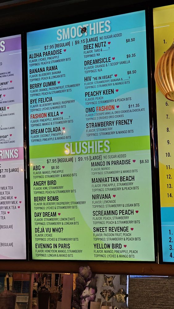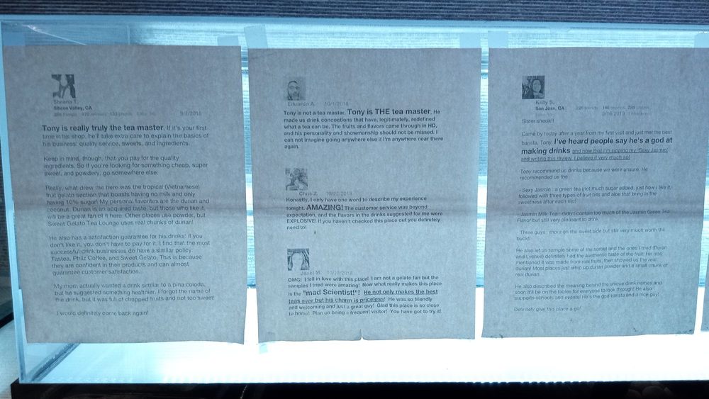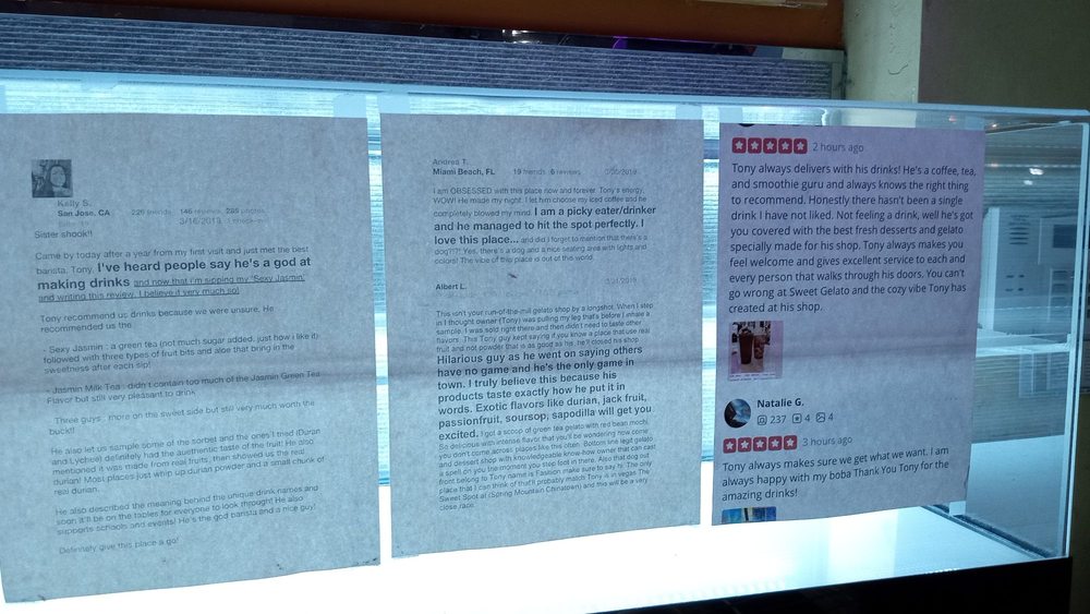 Customers rave about the excellent service provided by the owner, Tony, who creates personalized drinks based on customers' preferences. The vibrant and inviting ambiance, along with the creative drink names, make for a delightful visit. Whether you're in the mood for a refreshing tea or a creamy milk drink, Sweet Gelato Tea Lounge is a must-visit spot for delicious and unique beverages.