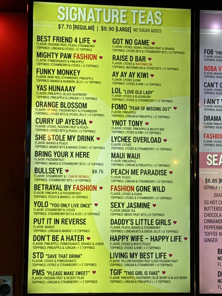 Flavor lychee, passion fruit & tony special recipe toppings: basil seeds and 4 bursting boba mango, strawberry, passion fruit & lychee.