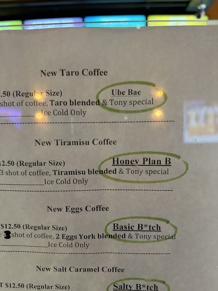 Drink from lid cup taste better. Fresh milk, 2 shots of coffee, 2 blended eggs yolk n tony special recipe hot or ice cold please drink from the lid cup taste better -not from the straw.